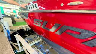 Some notable options and upgrades include the FXOne power folding tower with PTM Edge clamping board racks, upgraded JL audio with four tower speakers and two subs, Supra’s Swell 3.0 surf system with 4,100 lbs of sub floor ballasts, Vision Control command center with dual touchscreens, transom awareness camera, cockpit heater and heated captain’s seat, flip up transom seating and convertible center cockpit seat, RGB lighting and underwater lights, wireless phone charger, built-in battery maintainer, extendable bimini and over-the-tower mooring cover among other things.